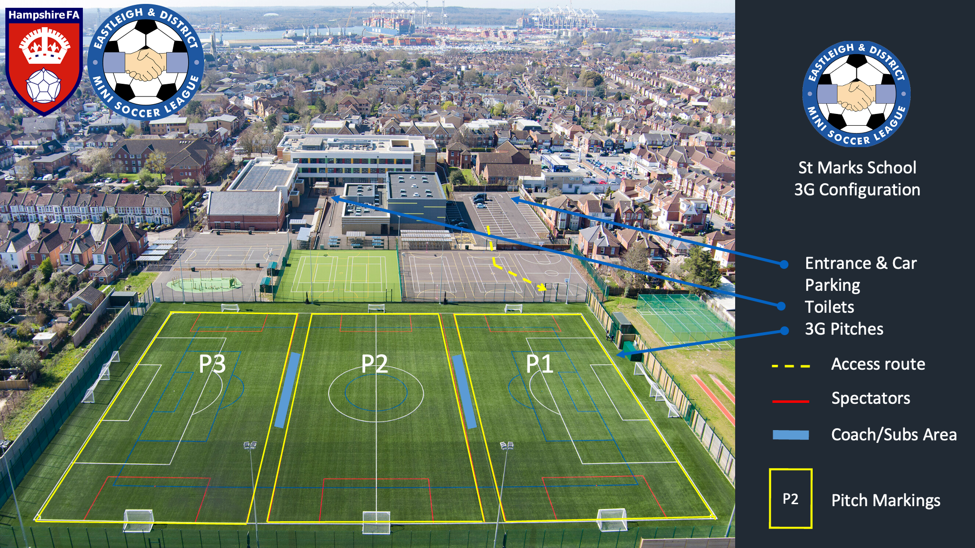 St Marks School has newly created 3G facilities and is used by EDMSL for U10s. Please note that the car park is situated off Malmesbury Place, SO15 5FS